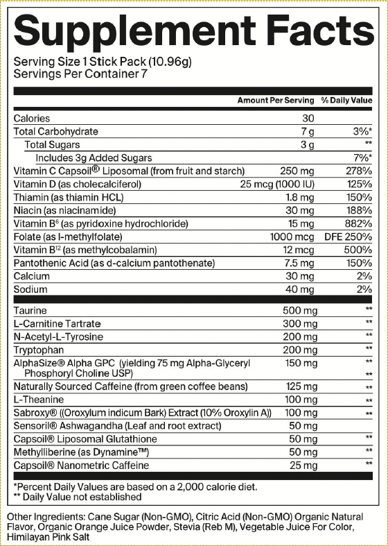 Go beyond synthetic caffeine, sugar, and chemicals. Our science-backed blend is a deliciously energizing solution formulated to uplift the mind, revitalize the body, and keep you fired up without burning out. * Sustained energy with Capsoil® enhanced nanometric caffeine optimized with Dynamine® to get rid of the crash. * Cognition and focus support with Alpha GPC, Sabroxy®, and Tyrosine. * Next-level antioxidants with advanced Capsoil® Liposomal Glutathione and Capsoil® Liposomal Vitamin C for superior immune support. * No jitters with L-Theanine to maintain an even flow state. * Elevated mood with uplifting Sensoril® Ashwaganda and Vitamin D for happiness in a bottle.